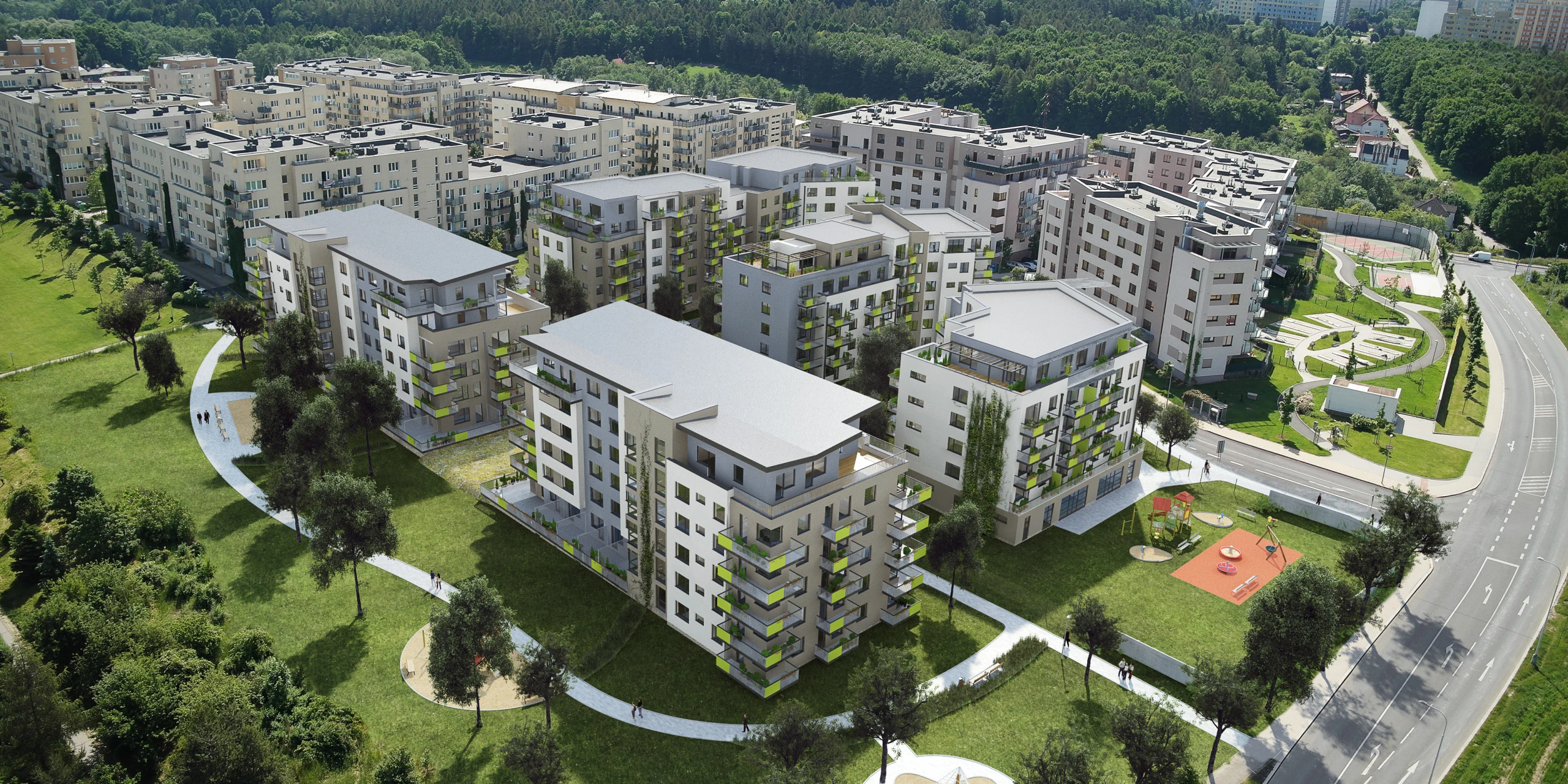 Atmosféru podtrhuje bohaté osazení areálu zelení, čímž vznikají klidné parkové relaxační zóny. Využity byly i popínavé rostliny jako neoddělitelná součást fasád budov.